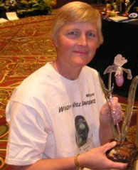 Show "Great Grand Champion" went to Phrag. China Dragon 'Windy Hill', owned and grown by Marilyn and Brian LeDoux, Windy Hill Gardens, Labadie, MO. Marilyn's plant took four trophies alone--an outstanding accomplishment.