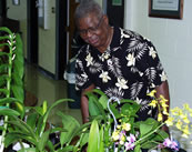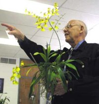 Lifelong orchid grower and longtime OSO member, the late, Dr. John Kramer performed the honor of serving as Auctioneer, trading off with Tom Larkin when the action becomes hectic enough to warrant a quick glass of water! Currently Tom works with Bruce Brown, OSO Webmaster during the auction to keep the plants moving. The OSO President and OSO Treasurer record sales, scribbling frantically to keep up with the final bids, while the OSO Vice-President usually races from podium to audience and back again, delivering plants! All of the auction attendees come away delighted with their purchases and, exhausted but pleased at the close of day, return to their cars with arms full and faces lit.